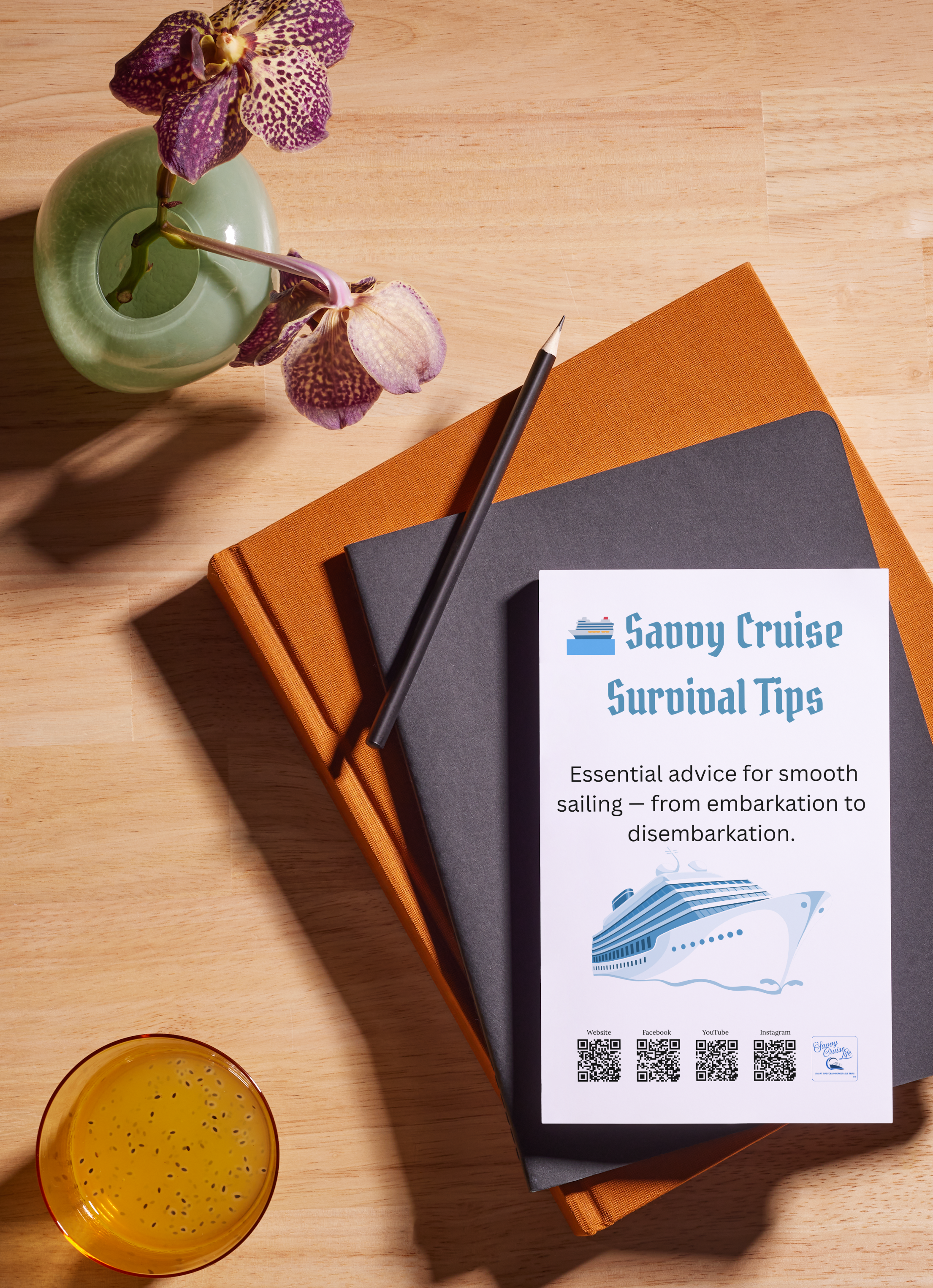 Your quick, printed cruise companion — designed to keep things running smoothly from embarkation to disembarkation. Whether you're a first-time cruiser or a seasoned traveler who likes to be prepared, this booklet is your cruise-week companion. Cruise Survival Tips covers the real, practical advice you won’t always hear from the cruise line — the kind that makes boarding smoother, sea days more relaxing, and little problems easier to solve.